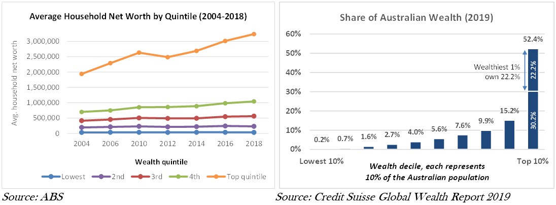 The economist Thomas Piketty (2013) argues that under neoliberal economic policies, those who make money from investment income have higher earnings capacity than workers who earn a salary. As a result, the rich get richer and the poor are locked out of participating in growth. We see this trend in Australia, with the evolution of wealth over the last 15 years resulting in severe wealth inequality (this is as far back as the ABS data goes). According to Credit Suisse, as of 2019, the bottom 10% of Australians owned 0.2% of all wealth, while the top 10% owned 52.4%.
