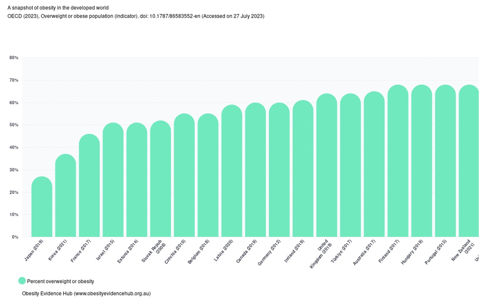 Graph 3: Percentage of population who are overweight or obese in Australia and other countries